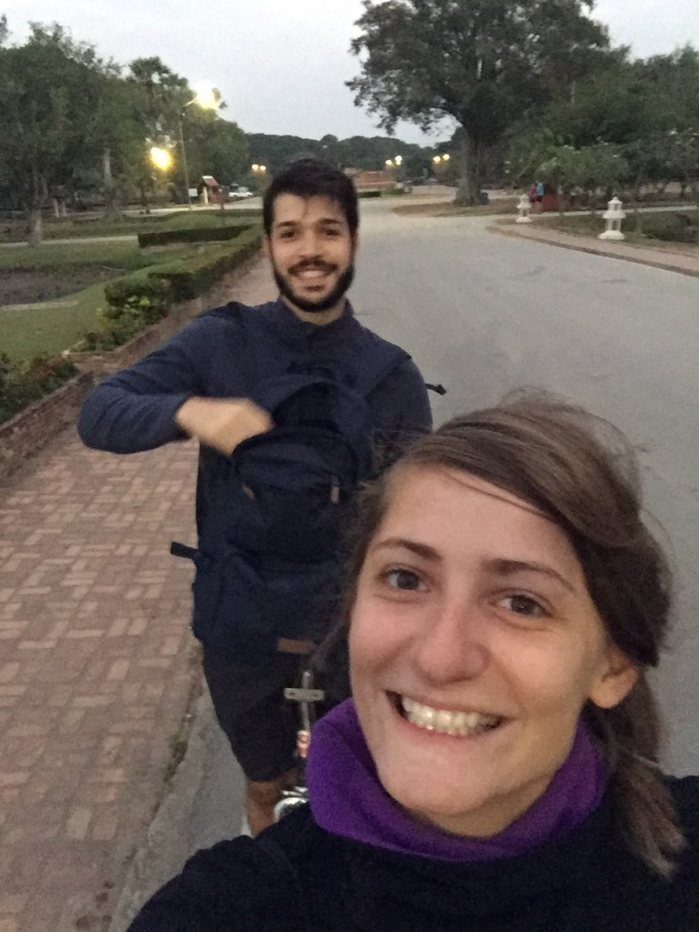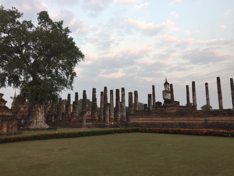 Cette ville n’est pas sur la ligne de train qui traverse le nord de la Thaïlande et ne fait pas toujours partie de l’itinéraire des voyageurs. Pourtant, elle renferme de vrais trésors. Ce matin réveil à 6h pour être seuls quelques heures à visiter les temples. Et nous ne regrettons pas ! Sur nos vélos à 6h30, nous entrons dans le parc historique en silence alors que le soleil n’est pas encore levé : c’est époustouflant. Nous sommes littéralement seuls dans ces immenses ruines à la lumière de l’aube (avec quelques rares camarades au loin) et nous faisons en sorte de prendre un itinéraire différent du parcours classique pour éviter le monde. C’est réussi, jusqu’à 11h30 nous visitons les différents lieux du parc historique et nous promenons sur différentes routes de campagne à vélo tant qu’il fait encore frais.