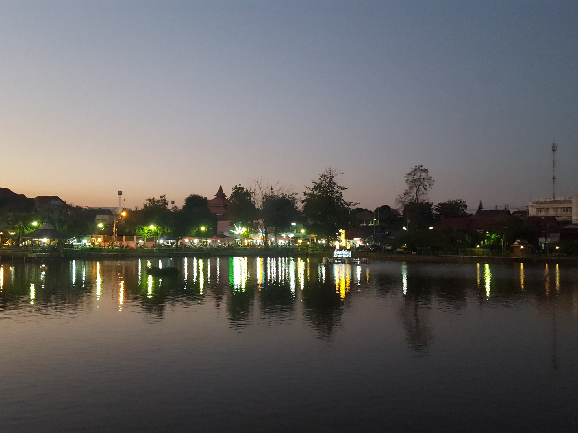 Ce soir nous nous baladons dans le grand marché de nuit qui fait le tour du lac (avec les lumières c’est encore plus joli) et encore un bon repas dans le même restaurant que ce midi, accompagné par des thaïlandais qui font un karaoké sur scène. Parfait !