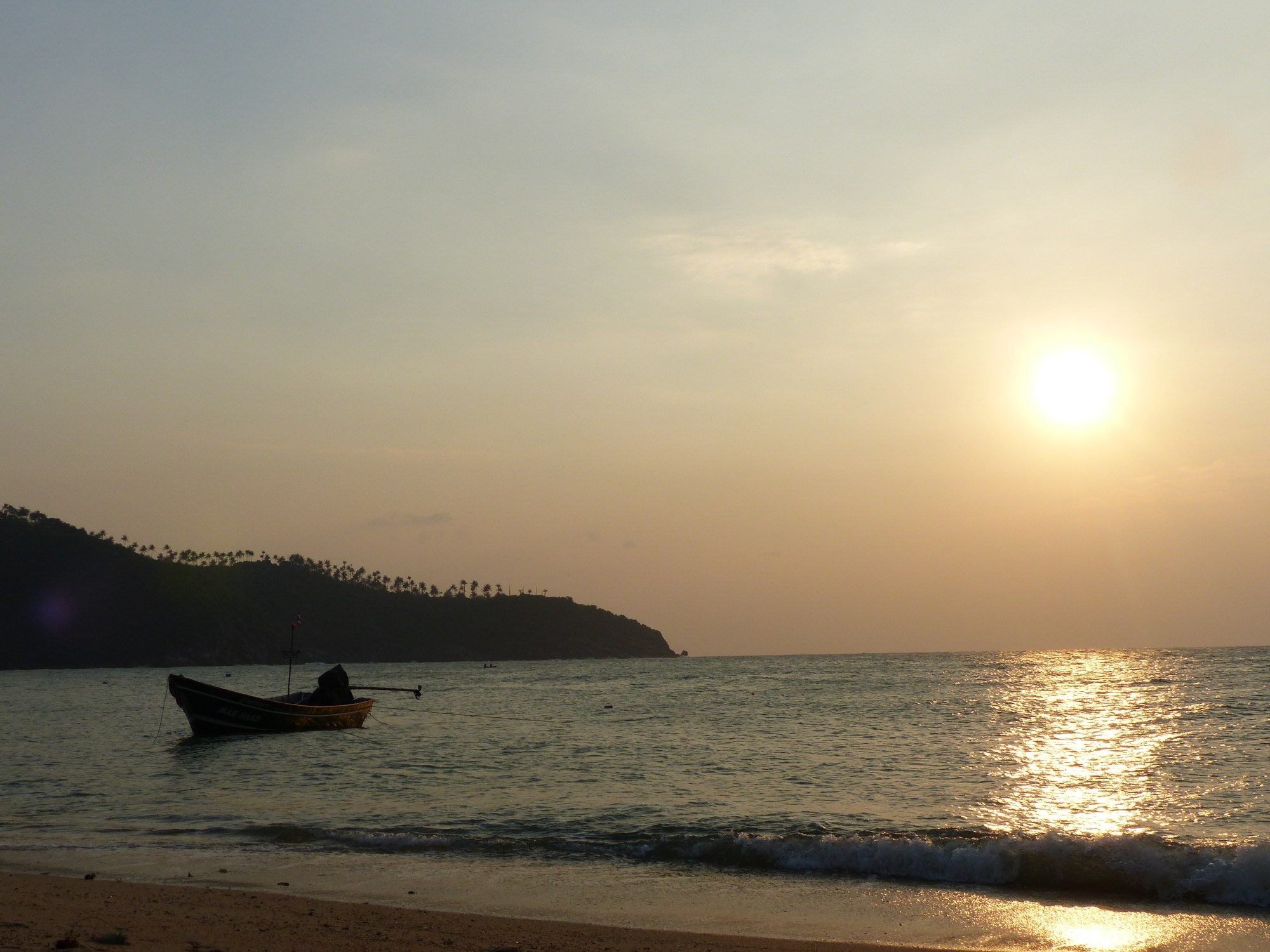 Ce matin, départ pour une autre île de la côte Est : Koh Phangan. Réputée pour la full moon party (énorme fiesta sur la plage, les gens viennent du monde entier) nous ne nous attendions pas à une grande tranquillité. Et pourtant ! Pour le logement nous avions réservé quelques jours avant en urgence parce qu’on s’est rendu compte que tout était très cher et que sans anticiper ce serait pire. Nous avons donc choisi en ligne une chambre dans un bungalow en bois, confort sommaire mais les avis étaient bons, vraiment pas cher et apparement « pas loin » d’une plage. Quelle surprise quand en arrivant nous sommes emmenés dans un bungalow (complètement rustique certes) les pieds dans l’eau ! Nous n’y croyons pas, nous avons non seulement vue sur la mer mais pieds sur la mer aussi :):)!